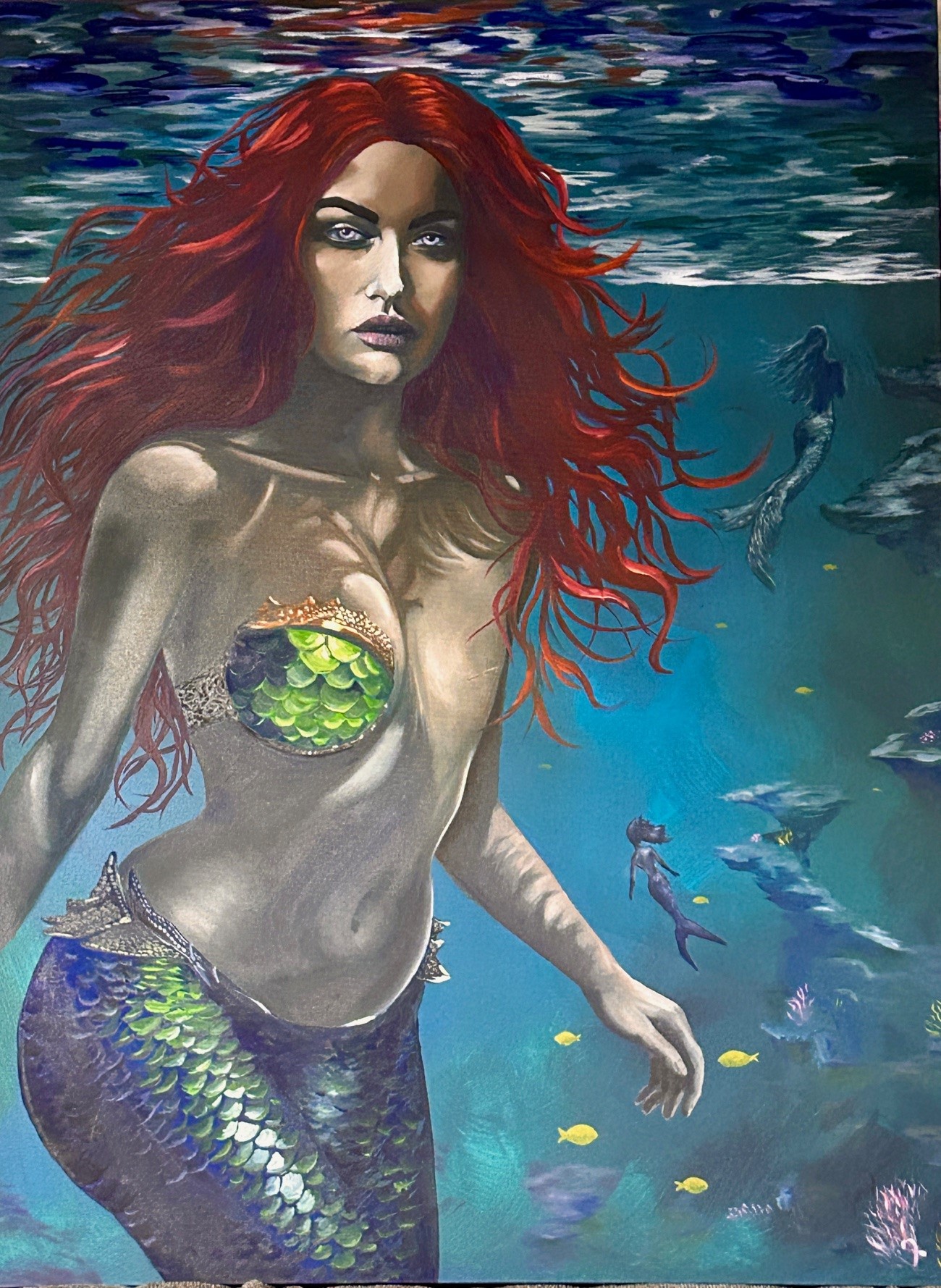 "Graceful and Stronger...I wanted to represent a beautiful and strong Mermaid in her own environment. She is very elegant and confident, and even though she has a scar for her left breast, she still keeps her magical presence."